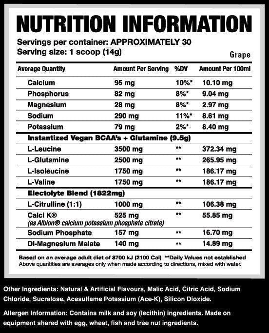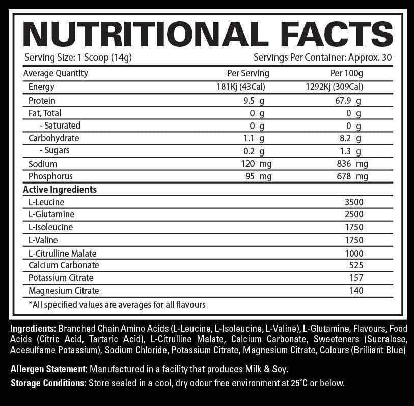 Mix 1 full scoop of Precision Nutrition’s BCAA formula with water to be consumed during and/or after a workout. Precision Nutrition’s Precision BCAA product will provide a whopping 7g of BCAA per scoop, with an added electrolyte blend and the addition of L-glutamine (2.5g). Precision Nutrition has come as precisely close as possible to producing the complete intra-workout, BCAA formula. With low calories, ultra low carbohydrates & no added sugars you will be amazed how good this product tastes!